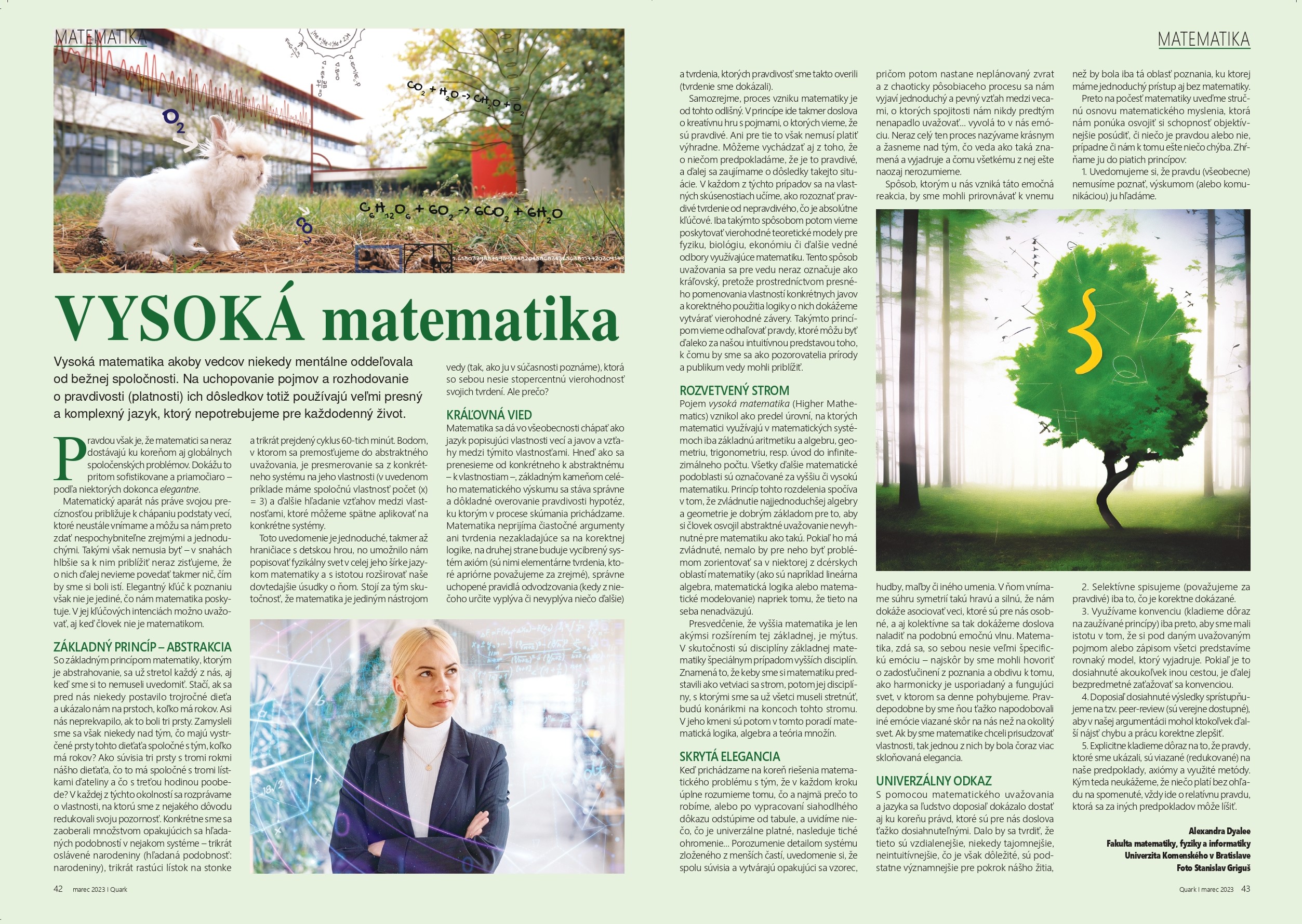 Článok „Vysoká matematika“ približuje, ako jazyk a logika vyššej matematiky ovplyvňujú a formujú nám vlastný spôsob uvažovania. Text bol publikovaný v populárno-vedeckom časopise Quark (03/2023) a spája filozofické a estetické pohľady na povahu abstraktného myslenia, spolu s pokusom vytvoriť posolstvo vychádzajúce z princípov vedeckej metódy.